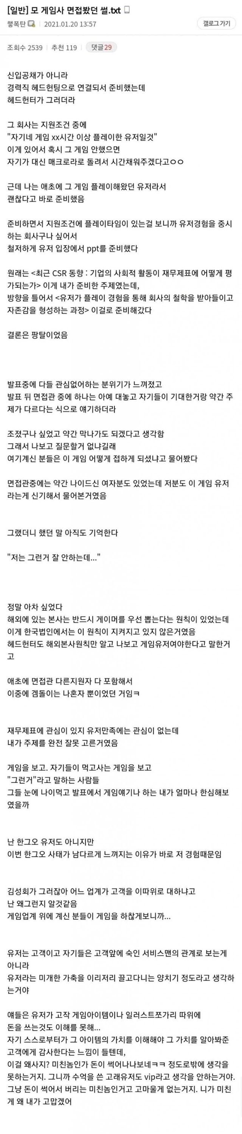 충격을 받았다는 게임회사 면접썰