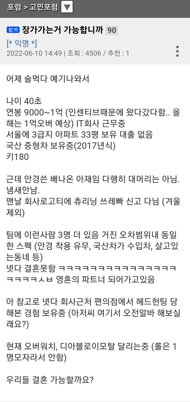 자기 결혼 가능하냐는 40대 뽐뿌인 스펙공개..