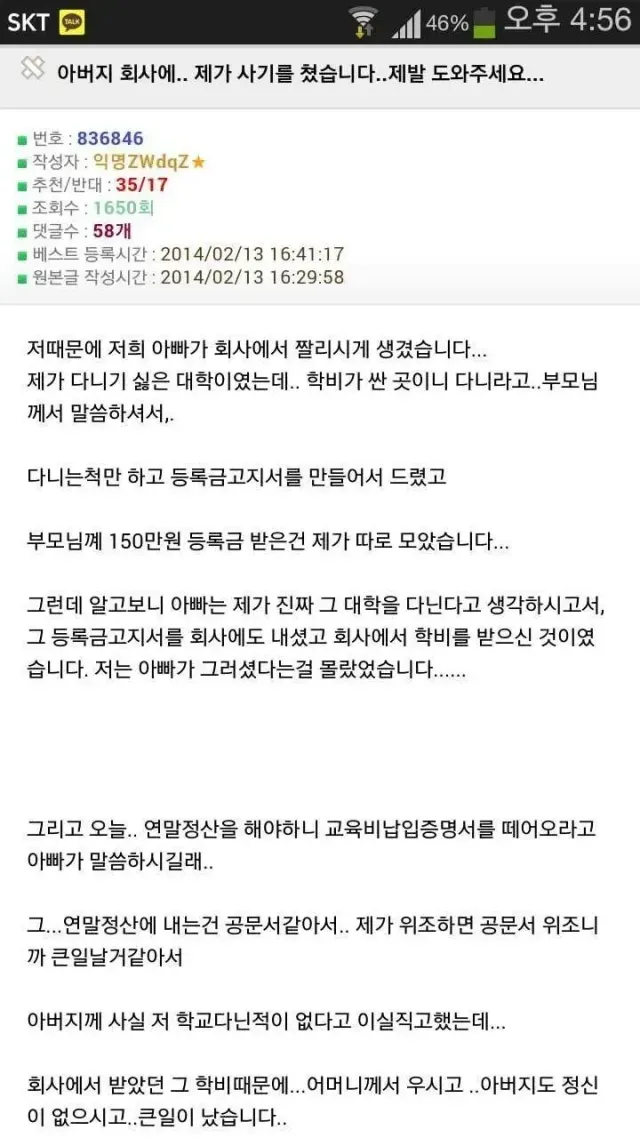 제가 아버지 회사에 사기를 쳤습니다 제발 도와주세요